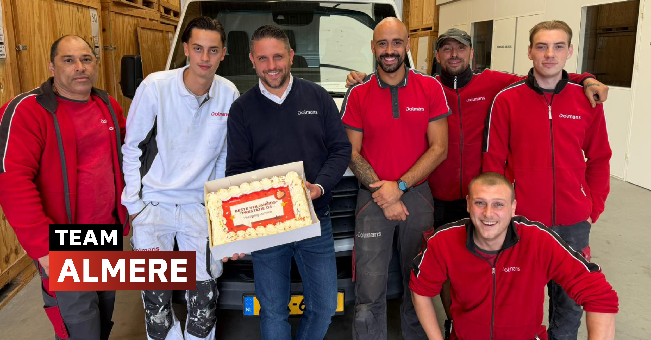 De veiligheidstaart is dit keer voor Almere. Daar laat het team zien dat veiligheid écht leeft. Toolboxen en WPI’s zijn altijd op orde en er is een open cultuur waarin collega’s met elkaar in gesprek blijven over veilig werken. Onder leiding van vestigingsmanager Jan-André Jacobs zorgt het team voor een prettige en veilige werkomgeving, een prachtig voorbeeld voor de rest van Dolmans.